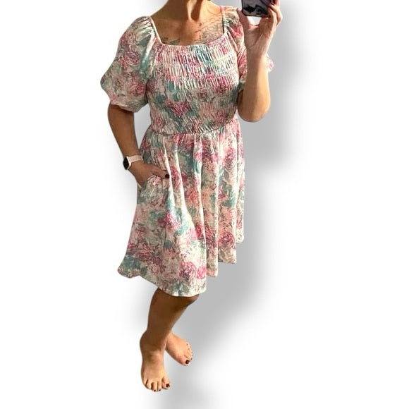 Alina, a whimsical and flowy knee-length nap dress that looks great on everybody, everywhere. A babydoll silhouette crafted in a lightweight crinkle knit fabric and a smocked bodice framed by charming bubble sleeves.