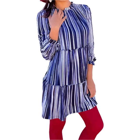 The Annabelle is a ruffle tiered dress with shirring at the shoulder, a ruffled neck with elastic casing, and a back keyhole with neckline button closure.