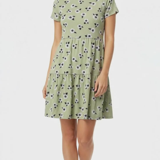 The Ariel is a three-tiered style dress with a rounded neckline, short sleeves, side seam pockets, and knee length.
