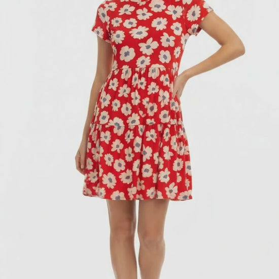 The Ariel is a three-tiered style dress with a rounded neckline, short sleeves, side seam pockets, and knee length.