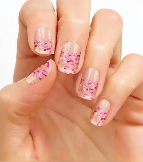 A transparent glitter dipped mix of red, purple, and gold glitter nail strips.