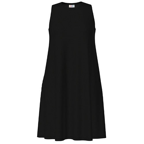 The Charlotte is a sleeveless swing dress with a high rounded neckline, side seam pockets, a seam at the center back, and a modified A-line silhouette.