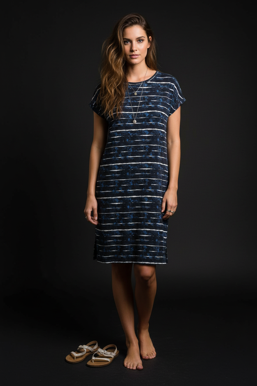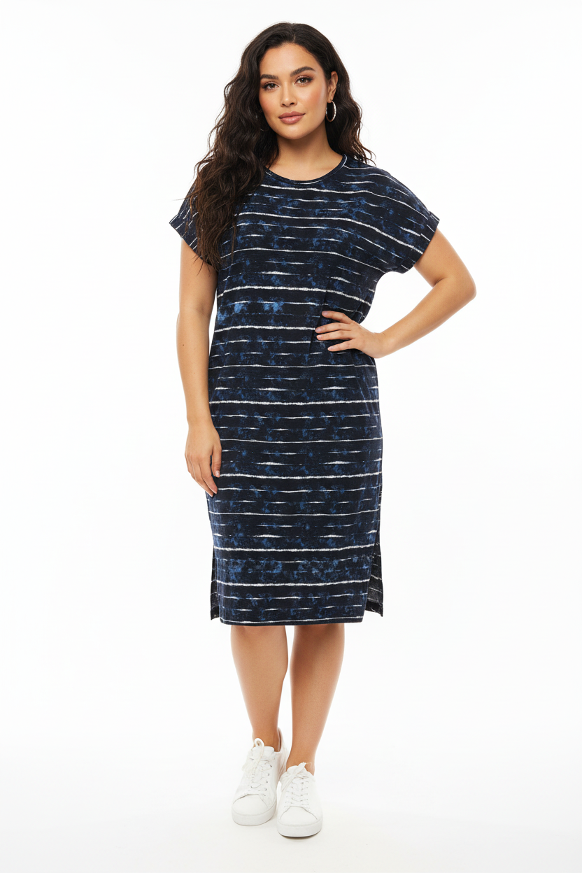 The Chelsea is a T-shirt dress with rolled cuffs with four tack joints to keep in place. She has a relaxed fit with a straight silhouette, side slit details, and a step hemline.