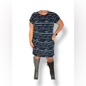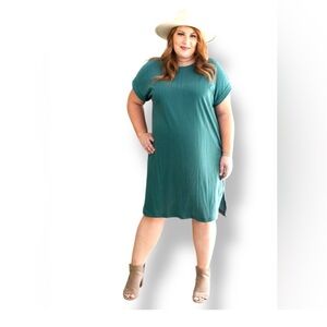 The Chelsea is a T-shirt dress with rolled cuffs with four tack joints to keep in place. She has a relaxed fit with a straight silhouette, side slit details, and a step hemline.