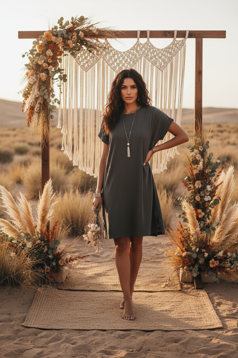 The Chelsea is a T-shirt dress with rolled cuffs with four tack joints to keep in place. She has a relaxed fit with a straight silhouette, side slit details, and a step hemline.