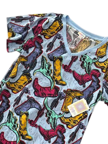 The Christy is a loose fitting, V-neck, short sleeve t-shirt with a straight front, curved back, high low hemline.