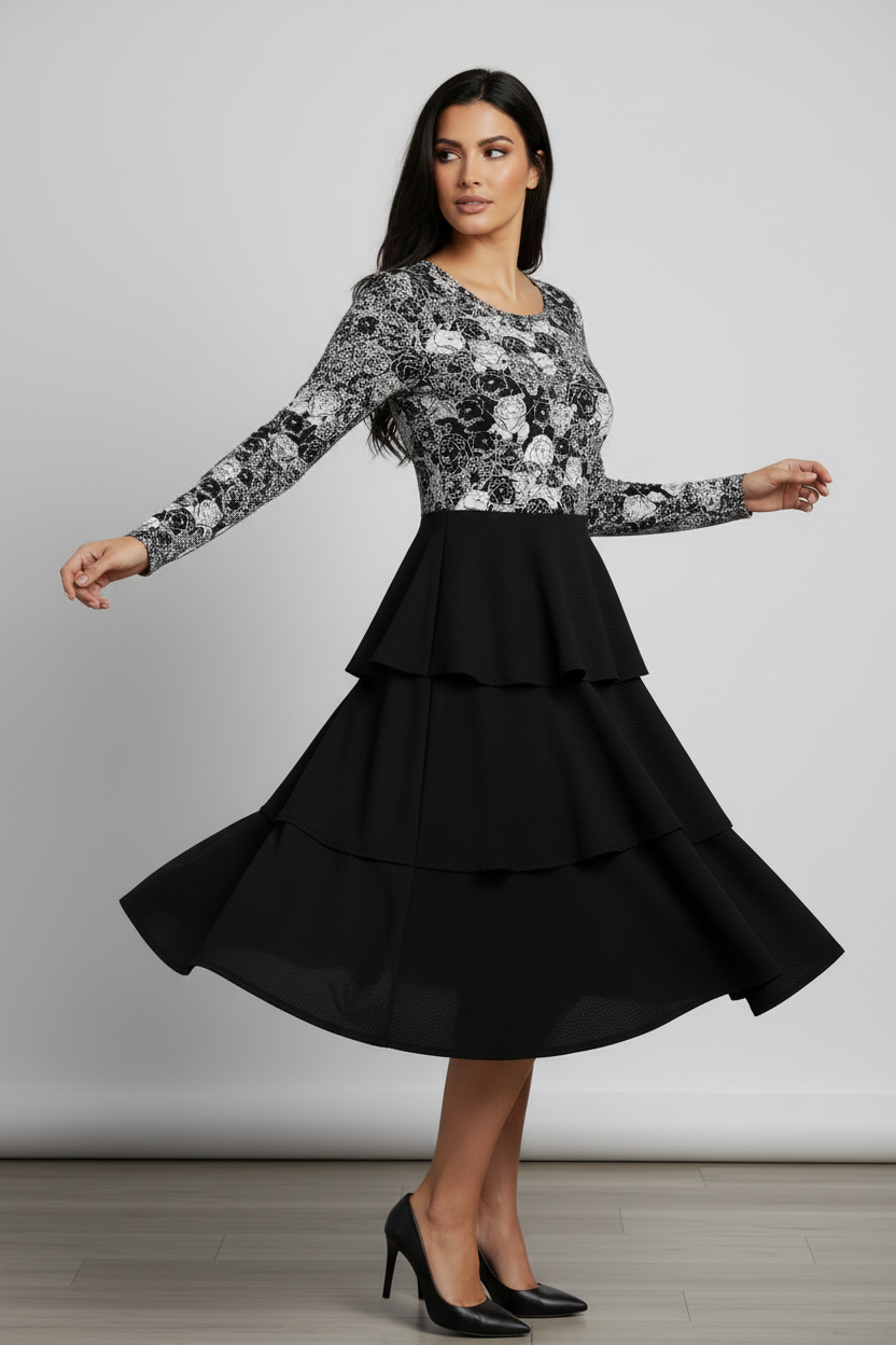 This playful dress boasts beautiful long sleeves and an ultra-flattering scoop neck, but its crowning feature is its flirty and feminine three-tiered skirt that demands you give it a twirl!