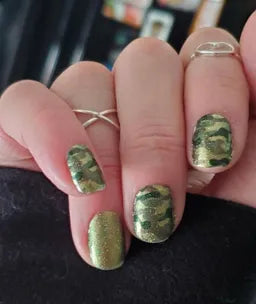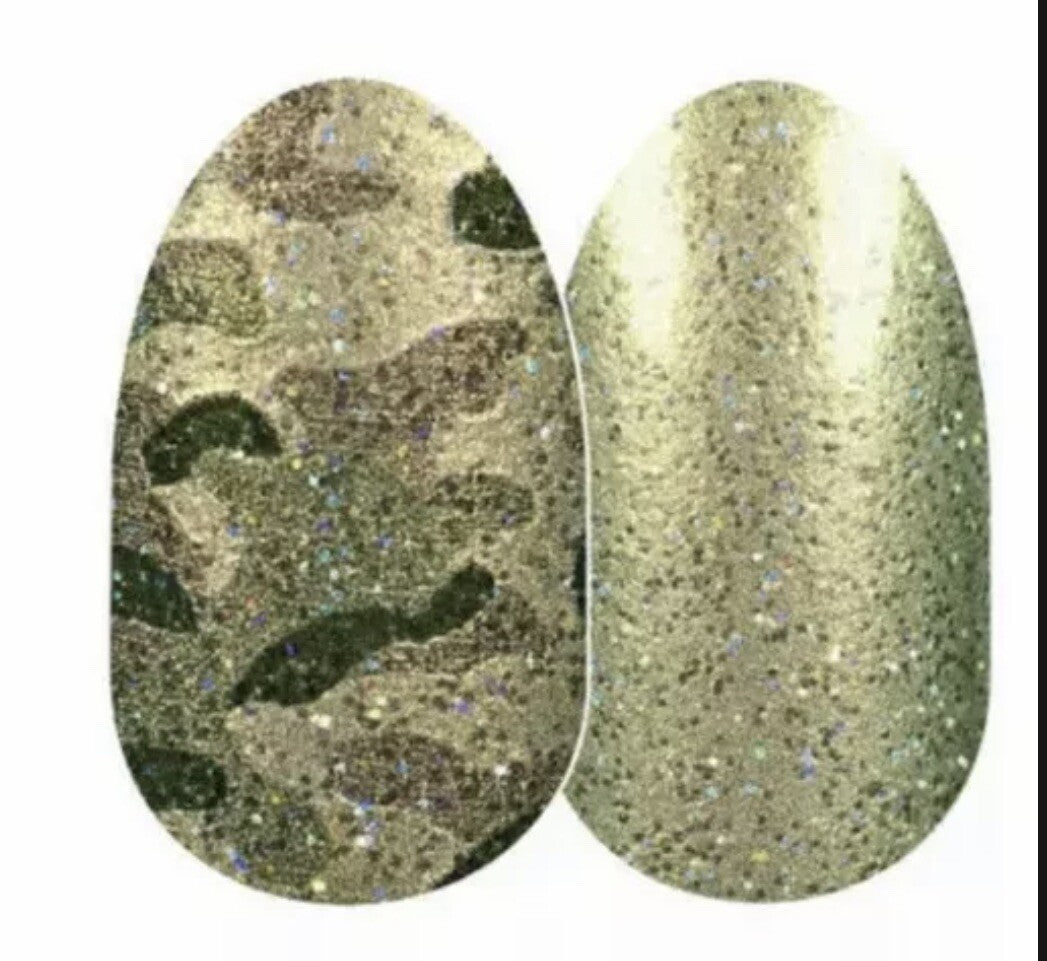 Glitzy, color shifting green-to-gold take on camo nail strips.