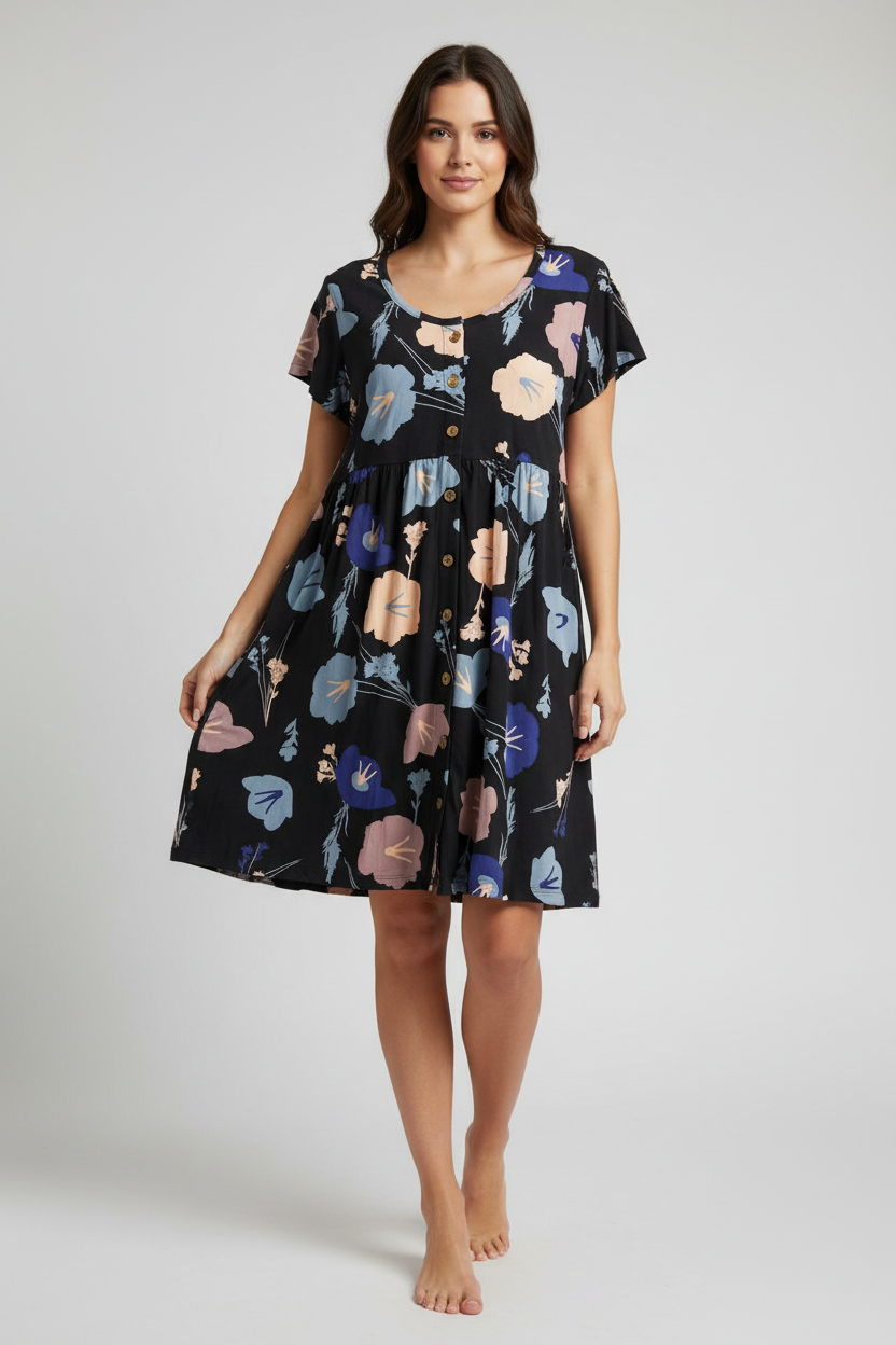 The Heidi is an above the knee baby doll dress with a V-neckline. She has fully functioning front button detail with antique brass buttons, a flutter sleeve, an elastic waist seam, side seam pockets, and a relaxed fit.