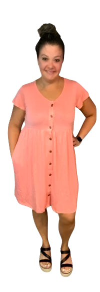 The Heidi is a baby doll dress with a V-neck and hits above the knee. She has functioning front button detail with antique brass buttons, a flutter sleeve, an elastic waist seam, and side seam pockets. She has a relaxed fit.