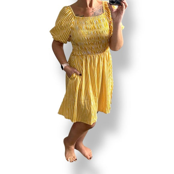 Alina, a whimsical and flowy knee-length nap dress that looks great on everybody, everywhere. A babydoll silhouette crafted in a lightweight crinkle knit fabric and a smocked bodice framed by charming bubble sleeves.