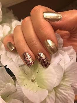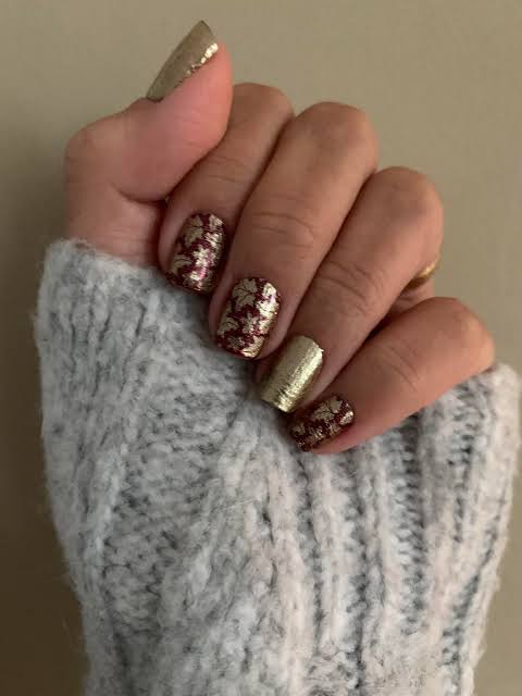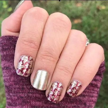 A fall-inspired burgundy and gold leaf design with a shimmer finish.