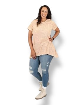 The Melissa is a tunic top with a shark-bite hemline. She's fitted in the bust and flares to a relaxed fit in the waist.