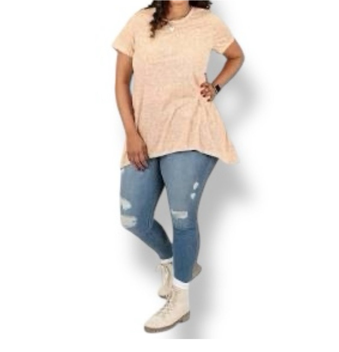 The Melissa is a tunic top with a shark-bite hemline. She's fitted in the bust and flares to a relaxed fit in the waist.