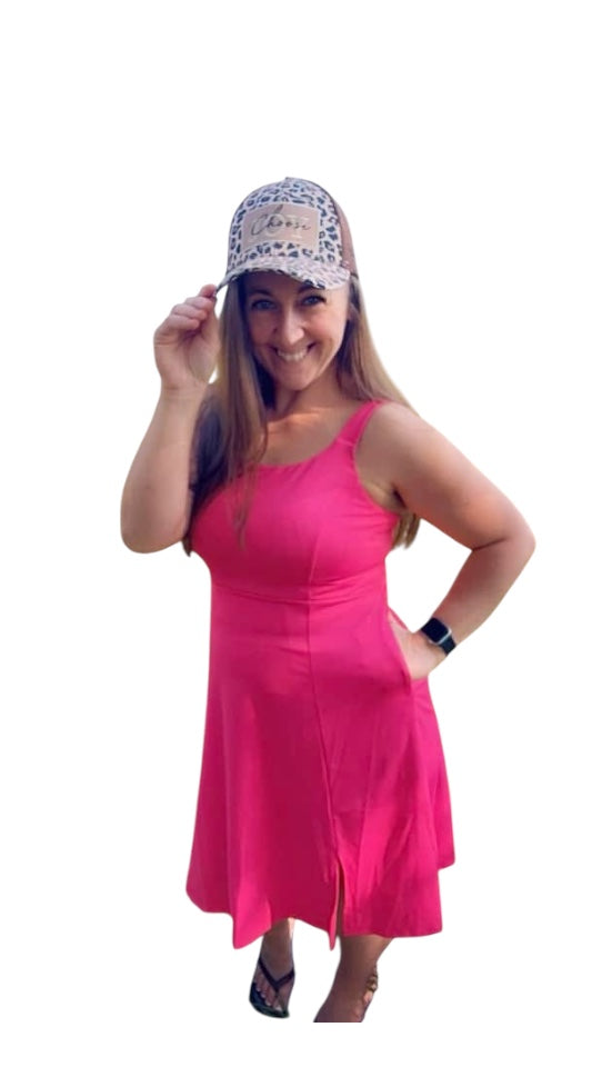 Introducing our Navy Cross Back Dress – the epitome of casual chic! Embrace the carefree spirit with this essential addition to your wardrobe. Crafted from a breathable and comfortable fabric, this dress ensures you stay cool and confident all day long. Its bra-friendly shoulder straps and removable cup inserts provide extra support, while the side seam pockets offer convenience without sacrificing style. Turn heads with the flirtatious side slit and show off the unique cross-back detail, featuring an elastic peek-a-boo design. Effortless elegance has never been this playful!