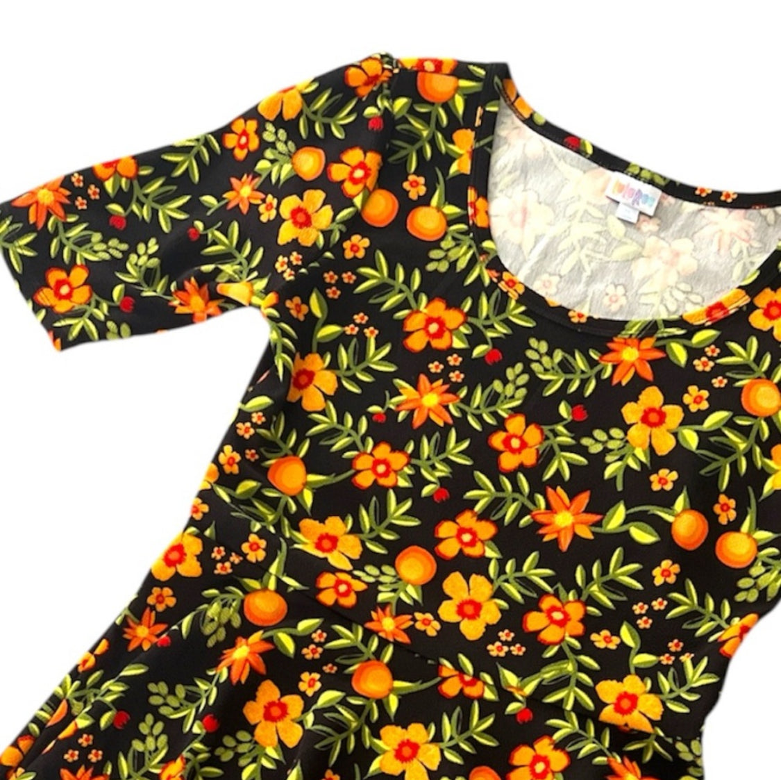 Featuring a vibrant orange floral pattern on a classic black background, a LuLaRoe Unicorn!