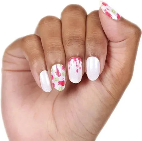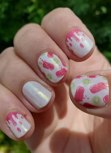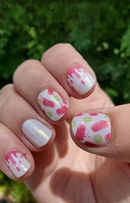 Features popsicle and lime patterns on a light pink base with a gold backing nail strips.
