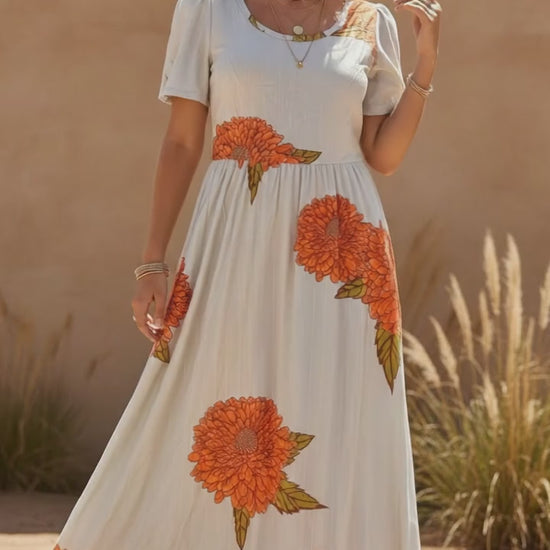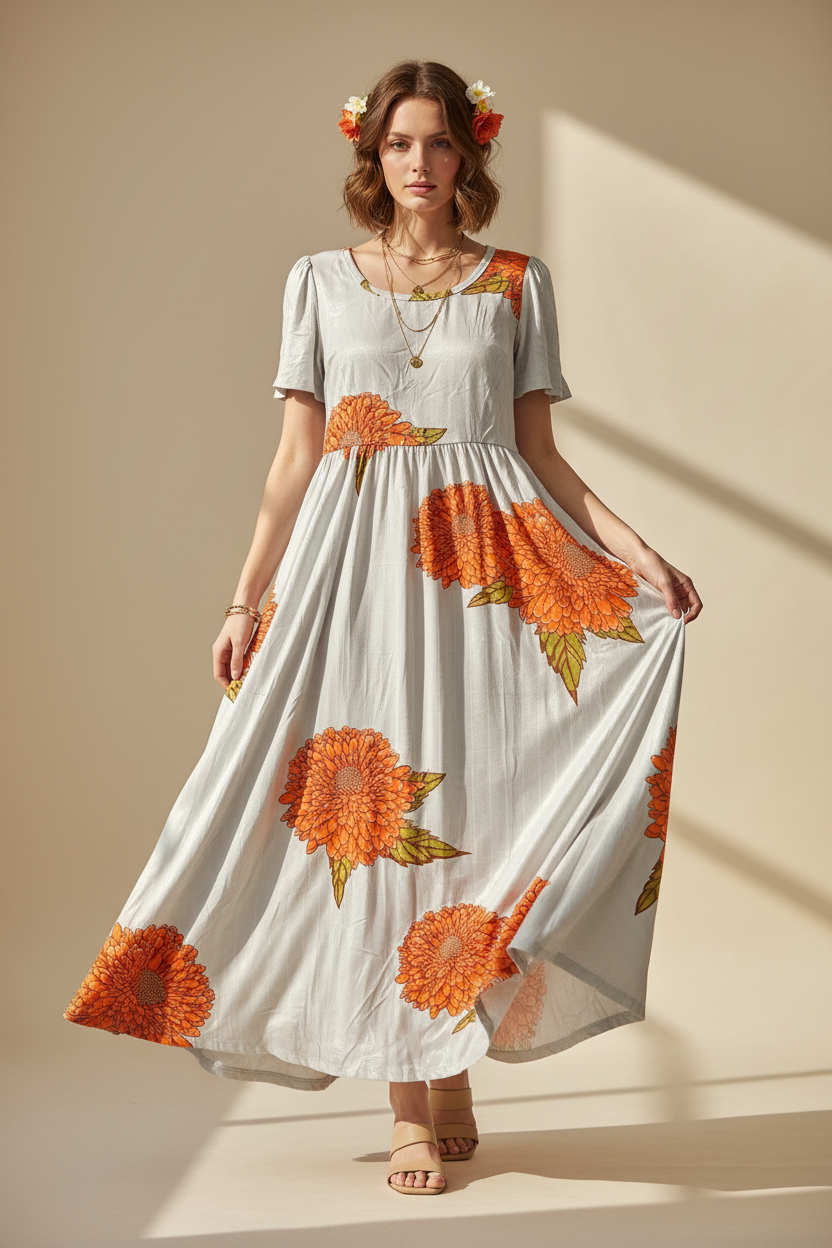 The Riley is a slit-sleeved dress with an elastic waist seam, a shirred skirt with shirring at the shoulder.