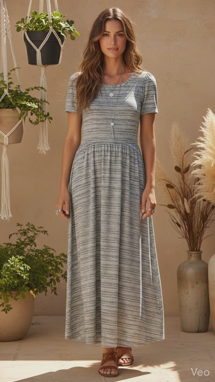 The Riley is a slit-sleeved dress with an elastic waist seam, a shirred skirt with shirring at the shoulder.