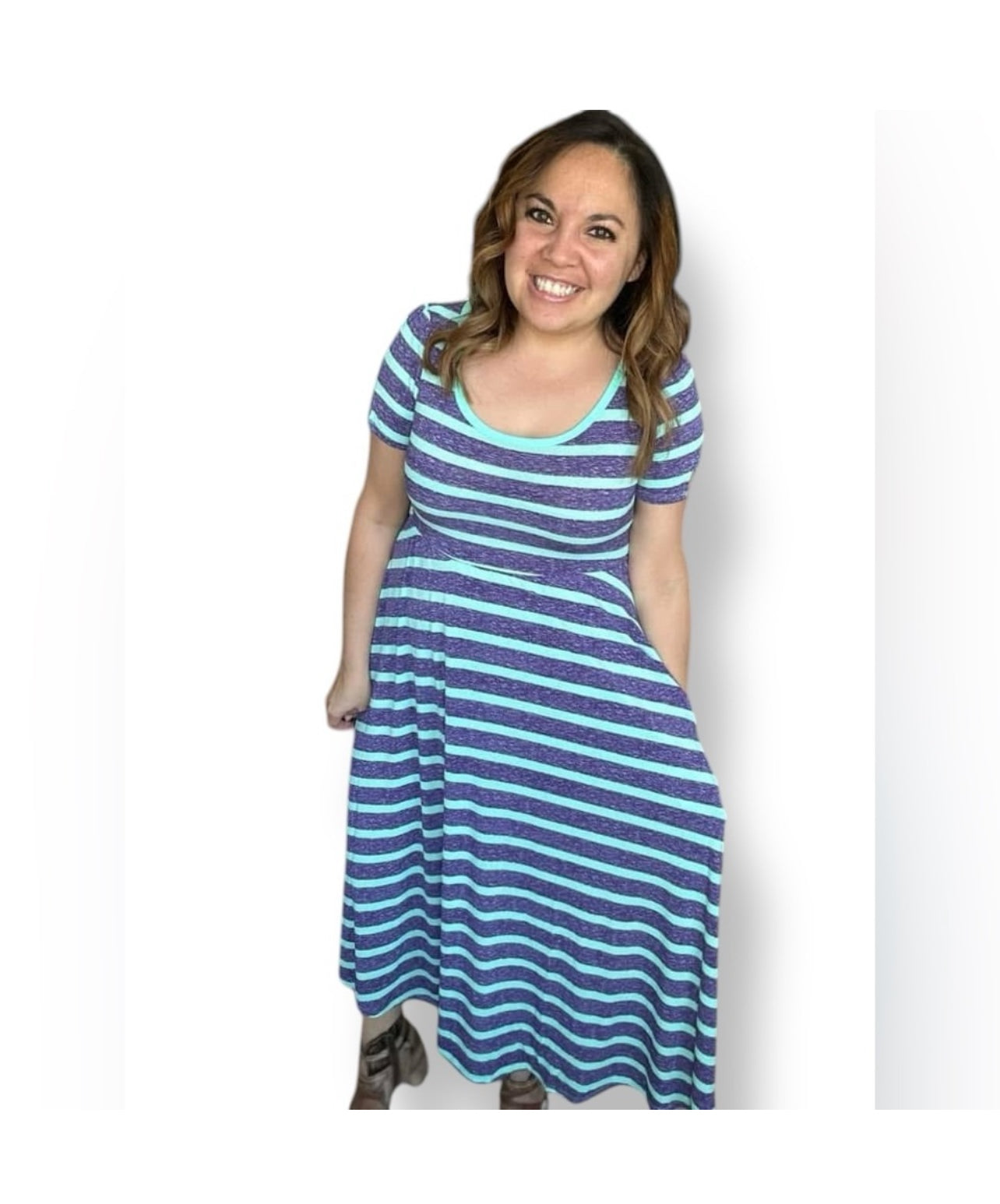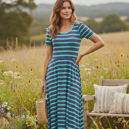 The Riley is a slit-sleeved dress with an elastic waist seam, a shirred skirt with shirring at the shoulder.