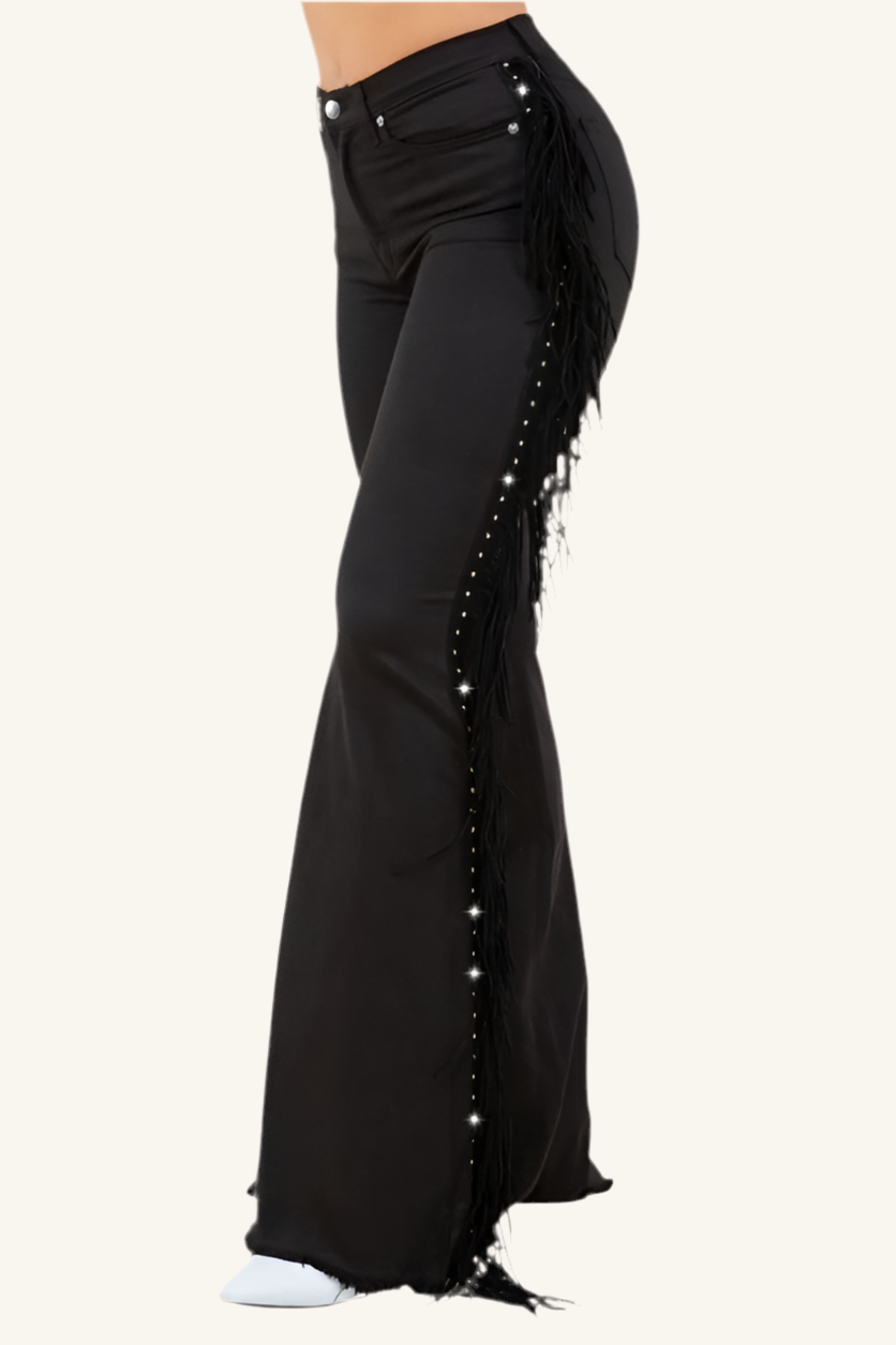Get ready to rock your style with our Fringe Bell Bottom Jean in our Updated Black Denim! These USA-made jeans have functional pockets, a zipper and button front closure, and a cool suede fringe tassel detail on the sides. With 3 inseam lengths to choose from, you can find the perfect fit. Trust us, you won't be disappointed!
